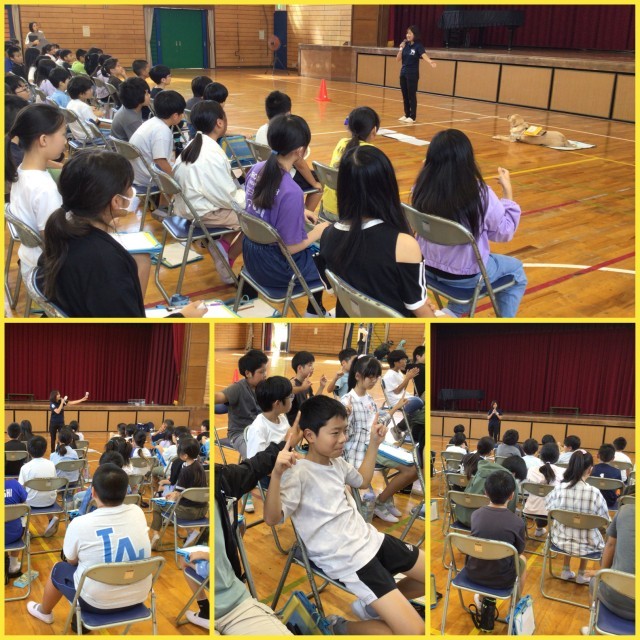 福祉実践教室の一環として、盲導犬講座が始まりました。3時間目は、視覚障害の方の見え方や、生活の中でのユニバーサルデザインについて説明を聞いています。事前学習で調べたことを発表している子もたくさんいます。