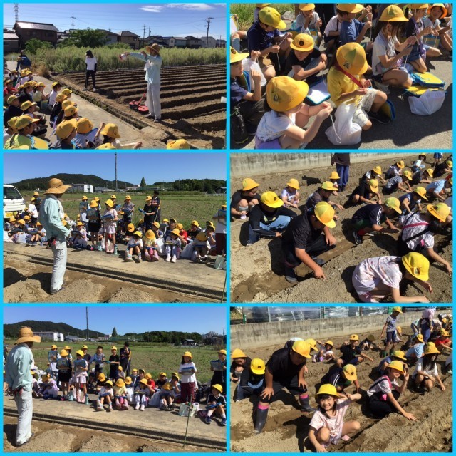 秋晴れの下、守口大根の畑まで行って種まき体験をしました。守口大根の種を見て、ホウセンカと大きさを比べたり匂いをかいだり…その後一人一人が畝に種の入った紐をまきました。守口大根の種は、ひもに入っているのを知ってびっくり!質問にもたくさん答えていただきました。
