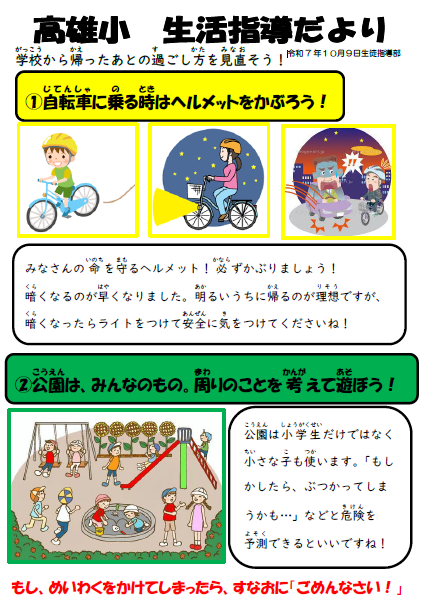 命を守るためのヘルメットは必ずかぶりましょう!日暮れが早くなりました。帰る時間もお家の人と相談してみてください。