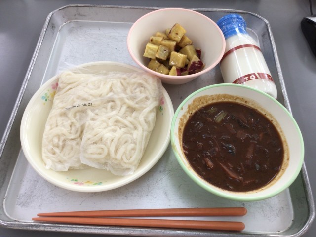 野菜大好き肉みそうどん 牛乳 大学芋 です。