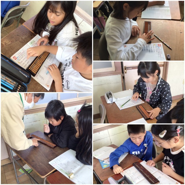 算数の時間に「そろばん」を使って計算する方法を学びました。実際に、計算ドリルの問題を、そろばんを用いて答えを求めました。