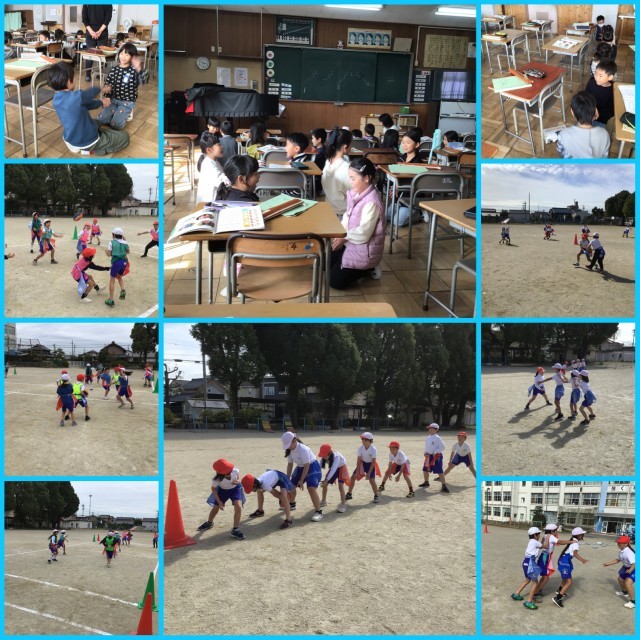 3年生の音楽と体育の様子です。音楽では手遊び歌を習い、友達と向き合って曲に合わせながら楽しみました。体育ではタグラグビーをしています。ラグビーボールを使ったゲームをしたり、タグを取り合ったり、チームで協力したり、楽しみながら過ごしています。