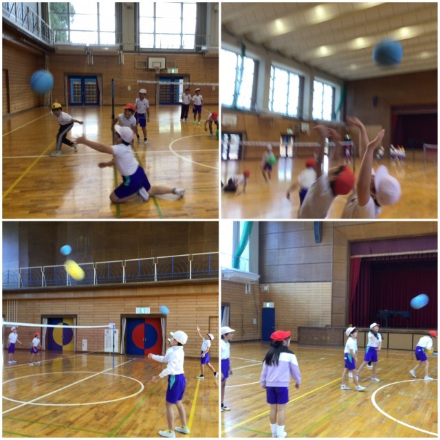 体育の時間にソフトバレーボールをしています。チームでサーブとトスの練習をしました。