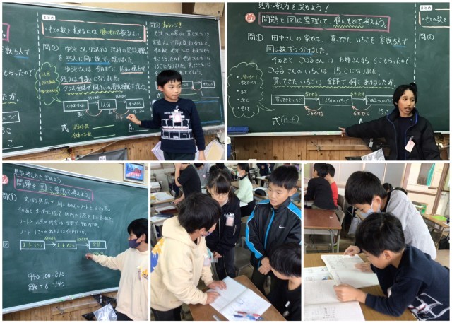 算数の「見方・考え方を深めよう」の学習では、図に表した後に、順に戻しす考え方を使って、求め方をお互いに説明し合いました。