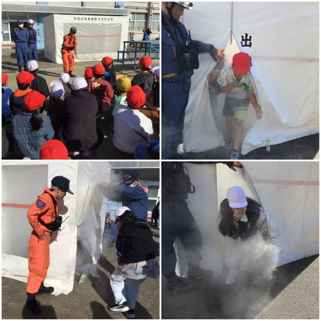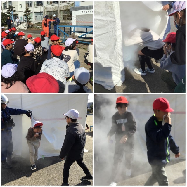 丹羽消防署の方たちにご協力いただいて、煙ハウス体験を行いました。煙が充満しているハウスの中を、ハンカチで口と鼻を覆い、姿勢を低くして通り抜けました。ハウスの中は思っていたよりも視界が悪く、出口までの経路に迷う児童もいました。初めての経験に興奮する様子でした。