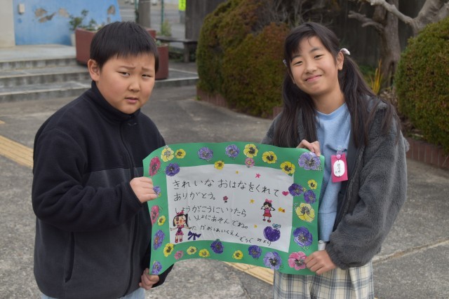 本日の昼に、高雄保育園ぞう組のみなさんが来校されました。高雄小学校で種から育てた苗を、昨年度から4年FBC委員会が保育園に配付していることに対して、お礼のお手紙をいただきました。学校を代表して4年FBC委員会の2人が手紙を受け取りました。高雄小学校で育てた苗は、保育園だけではなく、町内の学校や高雄地区のいろいろな場所で植えていただき、大切に育てていただいています。高雄小で育てた苗がどこで育っているのか探してみてくださいね。