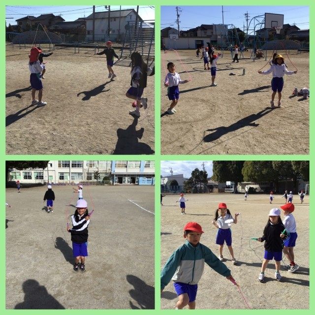 体育の時間に、縄跳びの練習をしています。前まわりや後ろまわりやあやとびなど、たくさん跳べるように、みんな一生懸命練習しています。寒さに負けず、頑張っています。