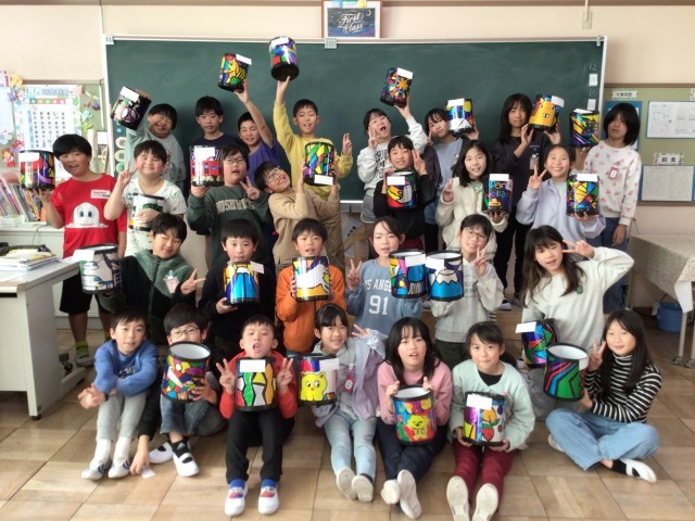 「カラフルできれい」「光に反射してキラキラしている」「色の使い方が面白い」など、友達の作品を見て感想を伝え合いました。ぜひお家で飾ってくださいね。