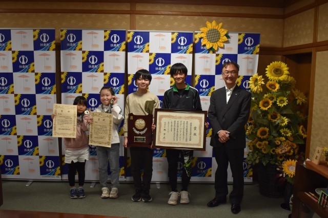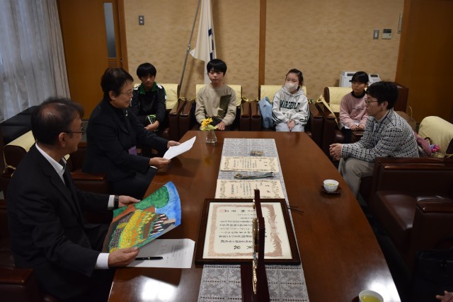 12/22(月)にFBCでの総務大臣賞受賞と「花と私の作文コンクール」愛知県教育委員会賞、「私たちの学校花壇を描いた写生コンクール」愛知県知事賞を報告する町長表敬訪問に行ってきました。前期環境委員長の水谷さんと阿部さん、作文で特選となった沢田さん、絵画で特選となった松島さんが、鯖瀬町長と澤木教育長に「どんなことが大変だったか」「どんなことが楽しかったか」「FBCを通してどんなことを感じたか」を話しました。また、鯖瀬町長からは「高雄の花をどんどん地域にも広げてほしい」、澤木教育長からは「高雄伝統の花を引き継いでいってほしい」というお言葉をいただきました。これからも高雄の花を大切に育てていきます。
