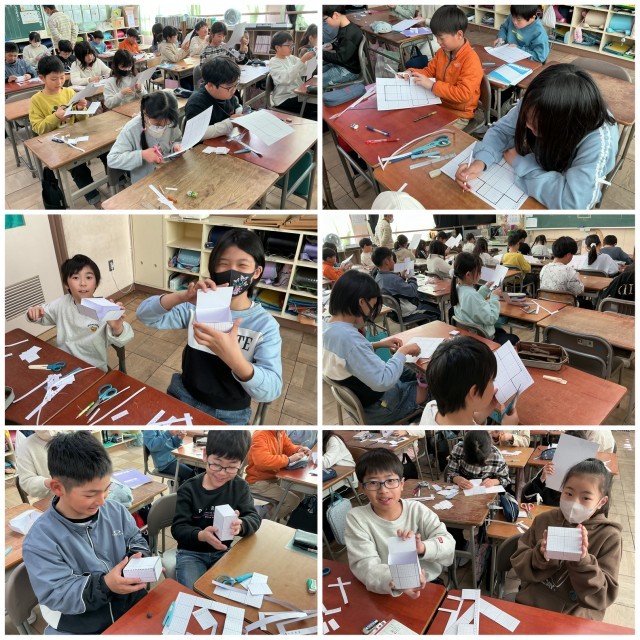 「直方体と立方体」の学習で、方眼紙に展開図を書き、それを切り取って直方体を作りました。実際に箱の形が出来上がると、箱を開いたり閉じたりして展開図の仕組みを確かめ、嬉しそうに見せあっていました。