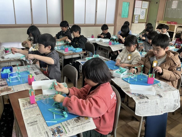 ストローと粘土玉がいくついるかを考えて、箱の形を作りました。長方形や正方形を組み合わせて集中して作っていました。