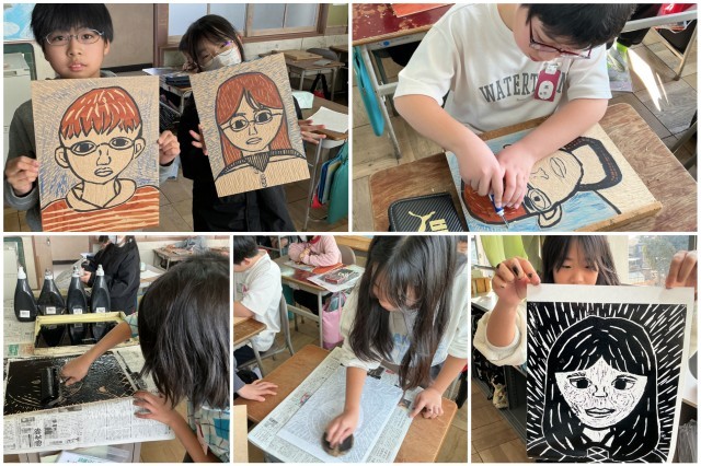 図画工作の時間に、木版画で自分の顔を作りました。丁寧に、下書きをして、彫刻刀で彫りました。作った木版にインクをつけて、印刷しました。自分そっくりの作品が出来上がりました。