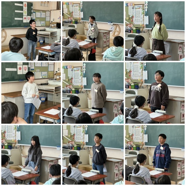 日課を表す表現を使って、自分の生活を紹介しました。少し緊張している児童もいましたが、学習したことを活かして自信を持って発表できました。