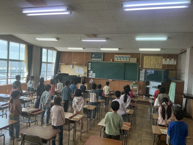音楽の授業で、校歌の練習をしました。1番、2番、3番の歌詞の違いに気をつけて歌います。順番に気をつけて、歌うことができましたね。