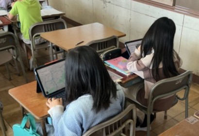 社会科の時間に、タブレットを使って、愛知県のことについて調べています。4年生の社会科では愛知県のことについて、いろいろな学習をしていきます。がんばって覚えましょうね。