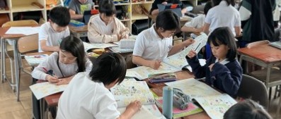 社会科で都道府県について学習をしています。今日はみんなに出題するクイズを作っています。タブレットや地図帳などを使って、クイズを作っています。クイズを作るには、その都道府県のことを知らないとできないので、自分の学びにもなりますね。