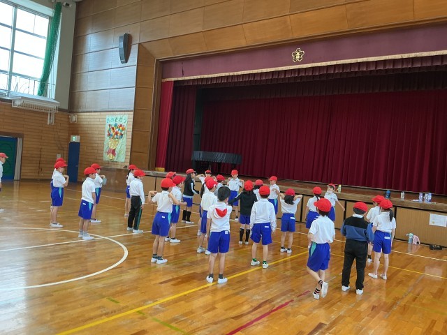 体育を頑張っています!体育館で並び方の練習をしました。素早く並ぶことが出来るようになりました。