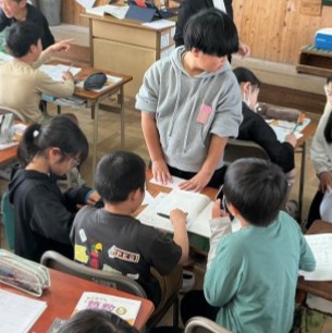 「たて✖️よこ✖️高さ」や「一辺✖️一辺✖️一辺」といった体積を求める公式を使って、複雑な形をした立体の体積の求め方を考えています。みんなで考え方を考え、色々な解き方があることがわかりましたね。立体を区切ることがポイントである事に気づきました。