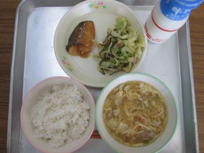 今日の給食のメニューは、麦ごはん、さばのみそ焼き、こんぶあえ、かきたま汁、牛乳です。