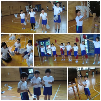 5,6年生で結成されている応援団。今週から活動が始まり、今日は振り付けをしたり、太鼓を叩いて合わせてみたりしました。初めてにしては、なかなかのでき!!5年生も太鼓を叩いたり、踊ったりと頑張っていました。運動会を盛り上げるぞぉー!!