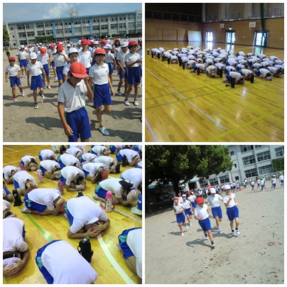 今日は、延期になっていた避難訓練が行われました。普段は、教室からの避難が多いですが、ソーラン節の練習で体育館にいたため、体育館からの避難となりました。緊急地震速報の音が鳴り、「地震が起きています」の放送に、体育館の中央で頭を抱えて、体を丸めて身を守りました。これまでと違って、自分を守ってくれる机や椅子などがない状況に、不安に思った子もいたようです。