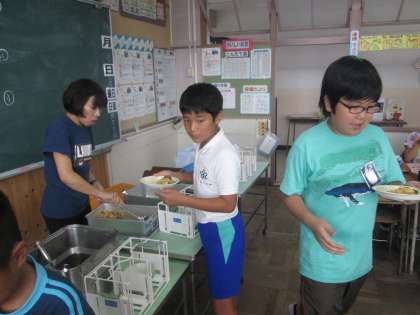 配食し終わったバットの中に少し残っているおかず。順に先生が声をかけてくださいます。ゴーヤおいしいねと声をかけるとおかわりの列ができます。