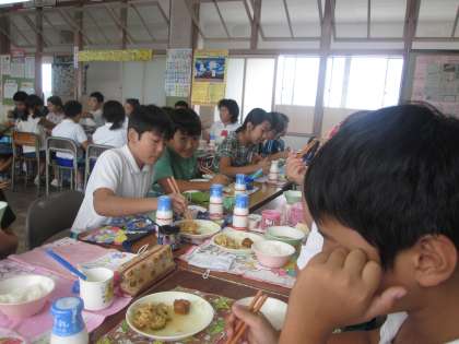 そこで、担任の先生の一言!「ゴーヤチャンプルーおいしいよ!食べられる子おいでー」