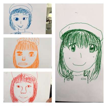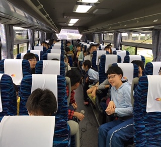 2号車 レクが始まっています。列で協力して、ガイドさんの似顔絵をかきました。