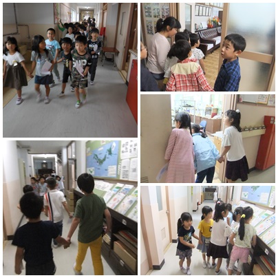 2年生のペアのお兄さんお姉さんと手をつなぎ、校内の好きな教室を、のぞいて回りました。