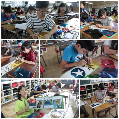 4年生は図画工作の時間でステンドボックスづくりを進めています。学級によって進み具合の差はありますが,カッターナイフを使い,ステンドの部分ができはじめてきました。思い思いのデザインが,セロファンできれいに仕上がっていきます。