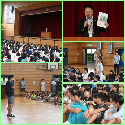 校長先生のお話では,はじめに「広報ふそう」の表紙絵を飾った本校児童の紹介があり,全校で称えました。葉森神社での思い出を描いた表紙絵が紹介され,葉森神社の由来や地域を愛することの大切さについてお話しされました。また,水の事故に関する注意についてもお話があり,川遊びや海における離岸流などの怖さを学びました。