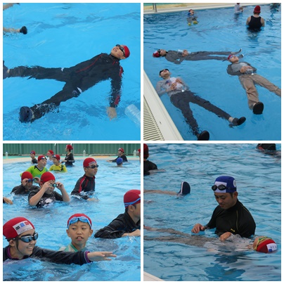 耳は水面下に、顔と足は水面上に出して「浮いて待て」でしたね。