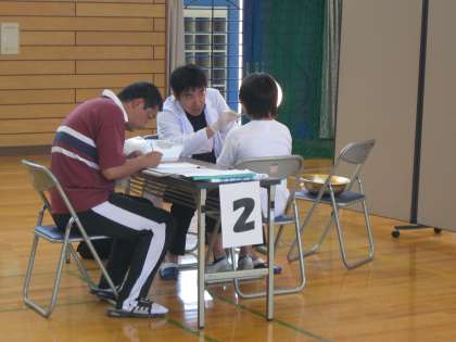 全クラスの児童対象に、歯科検診を5人の歯科医により体育館で行いました。