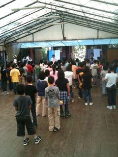 開村式。[絆.心を一つに輝き、ファイヤー!]いよいよキャンプ生活が始まります。