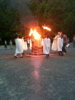 火の神より、友情、努力、勇気、前進、健康、笑顔の6つの火を分火してもらい、キャンプファイヤーの始まりです。