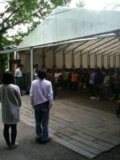 閉村式。園長さん「自然に感謝する気持ちを大切にすれば、きっと心も豊かになります。」保護者の皆様と天気に感謝。2日間ありがとうございました。14:15に出発します。