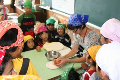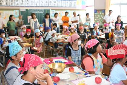 5年生は家庭科です。リンゴの皮むきに挑戦しました。