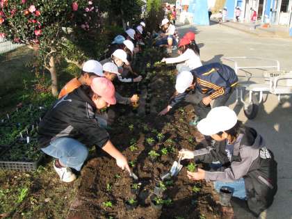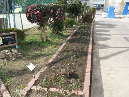 サブ花壇に春花苗を植えました。メイン花壇の横なので、メイン花壇のデザインが生きるような色合いに植えました。朝のくすのきタイムに作業をしました。