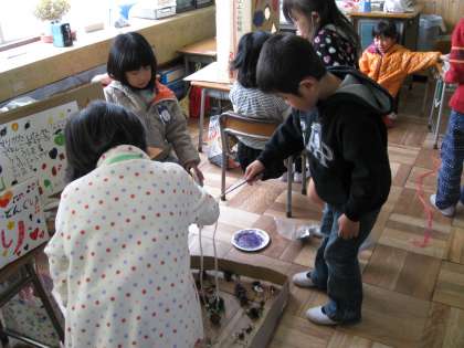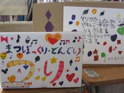 ドングリなど、秋の収穫物を使って、ゲームを中心としたお店屋さんを開きました。1年生3クラス全てで行っていました。お客さんの経験だけでなく、店を運営する体験もできて、楽しく学ぶよい機会でした。