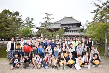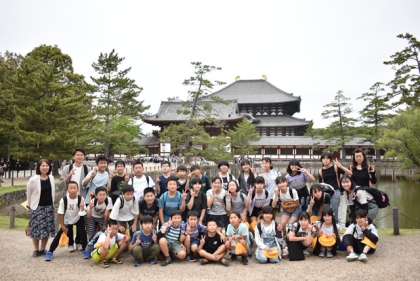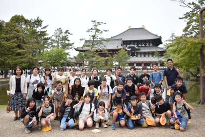 鏡池の前で学級写真を撮りました。 これから大仏殿に入ります。