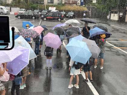 銀閣寺コースは駐車場に到着しました。見学スタートです。傘の光景ばかりになってしまいます。