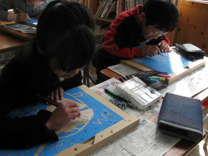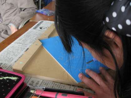 旧版画台は、約40年前の物でした。大切に使っていましたが、古くなり、斜めに固定する切り込みもありませんでした。そこで、厚さ12ミリのMDF合板を切り、新しく41個作成しました。4年生の児童は、できたてホヤホヤの版画台を活用し、ていねいに版画を作成しています。早速役立ちました。