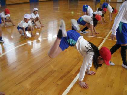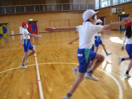 立春の今日ですが、体育館の中は、まだまだ冷えています。その中で、4年生に効果的に体力を高める方法であるケンケン運動のバリエーションや、腸腰筋(瞬発力向上に最も関わる股関節辺りの筋肉)を強くする股関節活性化ドリル、体をうまくコントロールしたり、滑らかな動きを行ったりといった様々な運動の基礎といえる能力を高めるために行うコーディネーショントレーニングを中心に行いました。