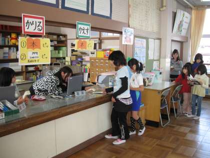 昼放課(あすなろタイム)には、児童が図書委員の指示に従って、本を返却したり、借りたりしています。指示があるまで、廊下できちんと並んで待っています。合図があると図書室に入って順序よく図書委員に本の処理をコンピュータで行ってもらいます。