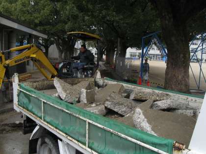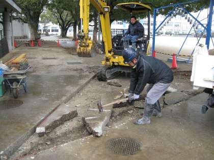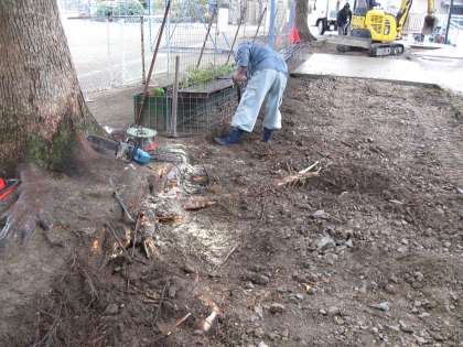 クスノキの根が大きくなったことで、ヒビ割れのコンクリートの地面を平らにします。ヒビのところでつまづきやすかったのでありがたいです。1日目はコンクリートをはつって、じゃまになって根を取っいます。雪の降る中、業者の方は本当に御苦労様です。