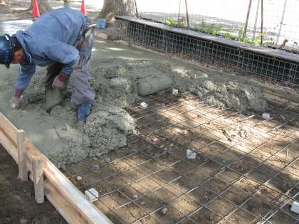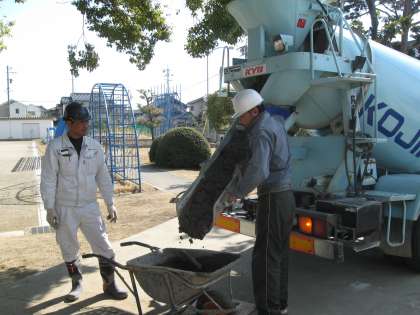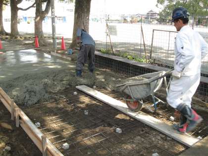 2日目は、コンクリートで埋める前に、平らに安定するように、基礎をしっかり作り、その上でコンクリートを流し込み、平らにする作業です。この日は、良い天気で、作業がしやすそうです。コンクリートも乾きやすいでしょう。