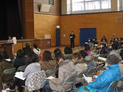 来年度(今年4月)入学する児童の保護者を対象に、午後から約2時間、新入学児童が高雄小学校の生活にスムーズに入ることができるように説明をする会を開きました。新しく購入する物品の紹介をするコーナーも設置されました。