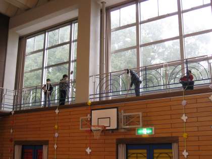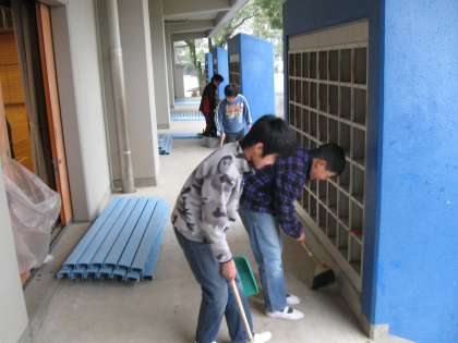 卒業を前に、学校を美しくしてくれました。ありがとう。この写真は体育館の2階の窓やピロティーと南側入り口をきれいにしている様子です。