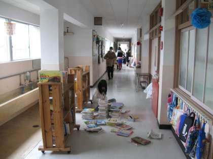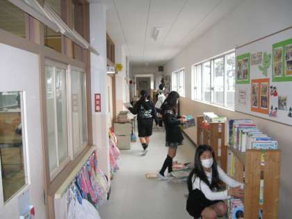 卒業を前に、学校を美しくしてくれました。ありがとう。この写真は各クラスの本棚の本の修理や掃除の様子です。