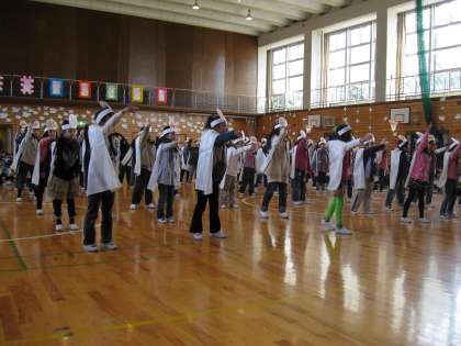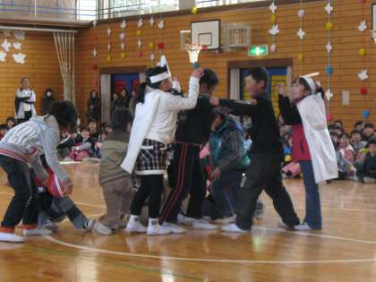 2年生の出し物は、劇からはじめました。もめ事を正義の味方の6年生がおさめ、その後替え歌を踊って歌いました。6年生はにこにこ見ていました。